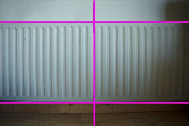 Am adăugat o linie dreaptă de orizont în Photoshop, dar puteți vedea că liniile drepte ale radiatorului se îndepărtează de ea. Pentru unele subiecte, acest lucru va conta mai mult decât altele.