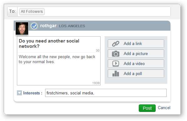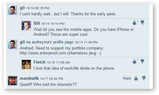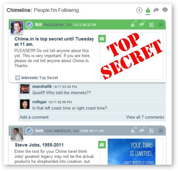 Gândiți-vă la Chimes ca la Tweets sau postări pe Facebook / Google +. Acesta este principalul lucru pe care îl faceți în orice rețea socială și în care Chime.in își concentrează cea mai mare parte a efortului.