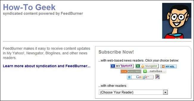 Aceasta este ceea ce veți vedea cel mai frecvent când faceți clic pe orice fel de link sau buton pentru a adăuga un flux RSS - o pagină de destinație care vă spune numele fluxului, vă oferă o casetă de linkuri rapide pentru a vă abona la conținutul din cititor de feed la alegere și apoi (care nu este afișat în imagine aici) o previzualizare a aspectului curent al feedului. (Notă: uneori, site-urile nu vor avea o pagină de destinație RSS, ci doar codul brut al fluxului RSS. În aceste cazuri, va trebui să lipiți URL-ul respectivului feed brut în cititorul de feed pentru al adăuga manual.)