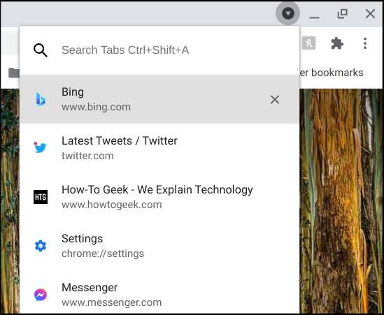 Dacă vă place să păstrați o mulțime de file deschise, acesta poate fi uneori greu de găsit pe cel pe care doriți. Chrome 87 introduce o pictogramă săgeată în bara de stare care vă permite să vedeți o listă cu toate filele deschise. Această listă include toate ferestrele Chrome, și aveți posibilitatea să tastați pentru a căuta prin intermediul lor.