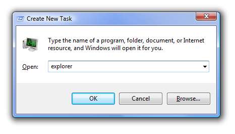Acum apăsați Fișier \ Deschidere în fereastra Task Manager, apoi tastați explorator în caseta Deschidere.