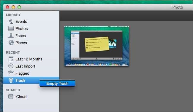 iPhoto, iMovie и Mail имеют свои собственные корзины для мусора. Если вы удалили медиафайлы из этих приложений, вам также необходимо очистить их корзины. Например, если вы используете iPhoto для управления фотографиями и удаления их в iPhoto, вам придется очистить корзину iPhoto, чтобы удалить их с жесткого диска. Для этого просто нажмите Ctrl + щелчок или щелкните правой кнопкой мыши параметр «Корзина» в этом конкретном приложении и выберите «Очистить корзину».
