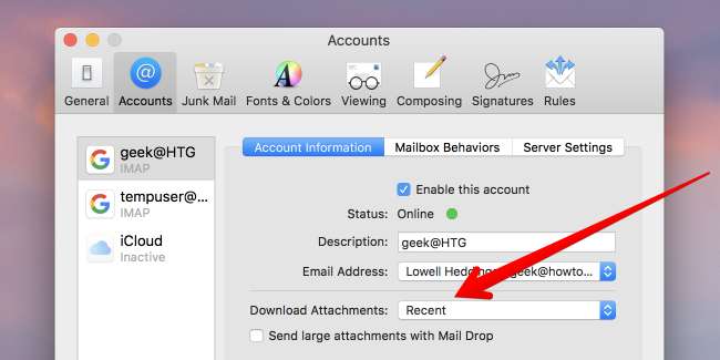 Вы можете измените настройки почты, чтобы не загружать вложения автоматически для экономии места или запустите инструмент очистки, чтобы избавиться от них. Если вы используете Gmail, вы можете установить ограничения на количество сообщений, синхронизируемых по IMAP по умолчанию, чтобы отображались только последние несколько тысяч, а не все. Перейдите в Почта -> Настройки -> Учетные записи -> Информация об учетной записи и измените раскрывающееся меню «Загрузить вложения» на «Недавние» или «Нет».