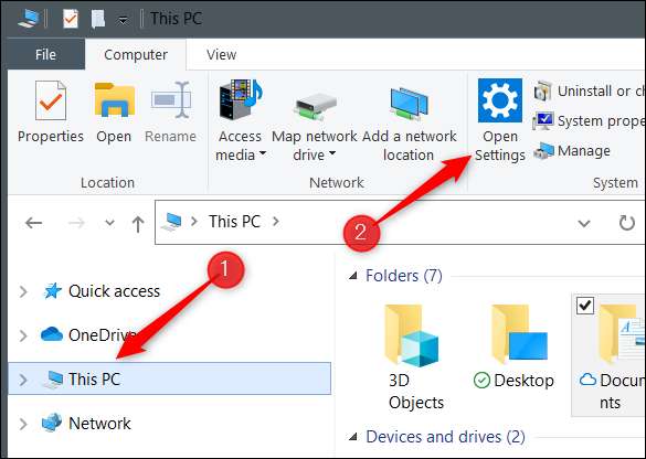 Далее в файловом проводнике нажмите «Этот компьютер» на левой панели, а затем нажмите «Открыть настройки» в ленте.