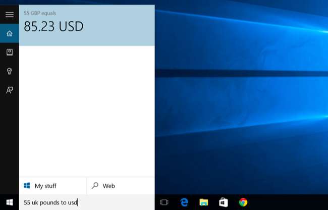 Вы можете спросить у Кортаны ответ на математический расчет, например, «324234 * 34234», или ввести преобразование единиц, например «55 фунтов стерлингов в доллары США». Это работает как с валютами, так и с другими типами единиц.