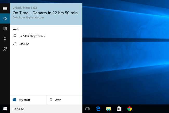 Кортана может отслеживать рейсы по номеру рейса, а пакеты - по их номерам отслеживания. Просто введите номер отслеживания полета или посылки в поле поиска Cortana - вы можете просто скопировать и вставить его - чтобы просмотреть текущий статус.