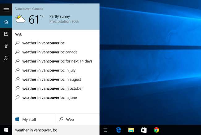 Используйте Кортану, чтобы быстро узнать погоду в разных местах. «Погода» покажет вам погоду в вашем текущем местоположении, а «Погода в [location]» покажет погоду в другом городе.