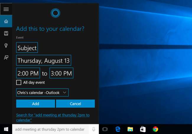 Кортана также может создавать календарь События. Просто скажите что-нибудь вроде «добавить встречу в четверг в 14:00 в календарь», и Кортана автоматически заполнит предоставленную вами информацию. Вы также можете просто начать с «добавить встречу», и Кортана запросит более подробную информацию.