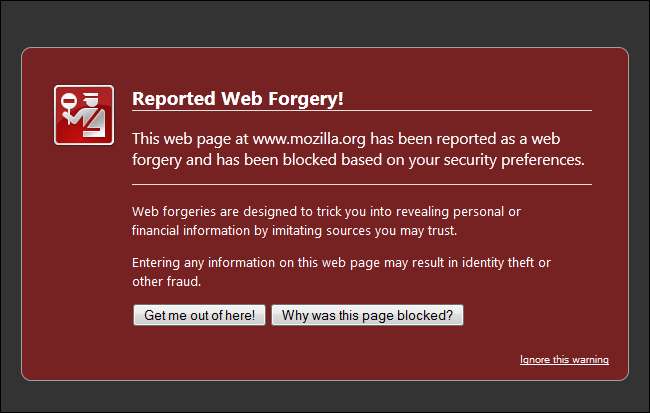 Ваш браузер также будет отображать предупреждения о фишинге (или «веб-подделке») и вредоносных программах. Независимо от того, используете ли вы Firefox, Chrome или Internet Explorer, ваш браузер регулярно загружает список опасных веб-сайтов. Когда вы попытаетесь подключиться к сайту из этого списка, вы увидите сообщение об ошибке.