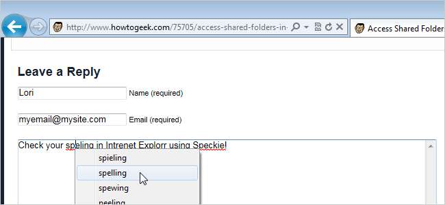 Вы можете не думать, что проверка орфографии полезна в браузере, но если вы используете много онлайн-форм (для комментариев, форумов и т. Д.) И используете Internet Explorer 9 (IE9), вы можете установить Speckie .