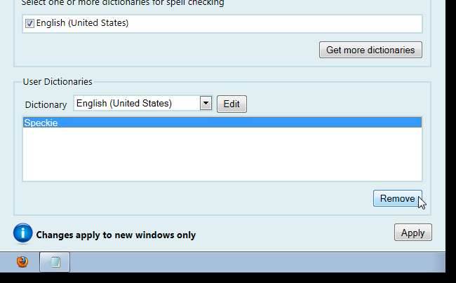 Если вы добавили какие-либо слова в словарь, вы можете редактировать эти записи в поле «Пользовательские словари» на вкладке «Настройки Speckie». Выберите словарь, в который вы добавили слово, и нажмите «Изменить». Добавленные вами слова перечислены в поле. Чтобы удалить ненужные записи, выберите запись и нажмите «Удалить». Опять же, не забудьте нажать Применить в нижней части вкладки, чтобы применить изменения.
