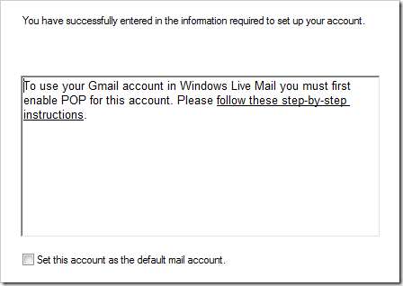 Затем вы получите сообщение с советом следовать инструкциям по настройке POP в Gmail. Просто проигнорируйте это, потому что мы уже настроили это в начале этой статьи. Однако вы можете проверить эту учетную запись по умолчанию.
