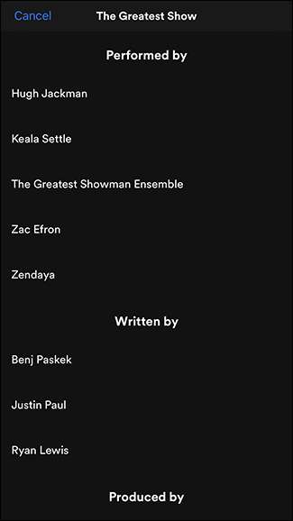 Выберите песню в Spotify, а затем перейдите в «Song Credits», чтобы увидеть их.