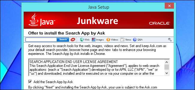 Java пытается установить ужасная панель инструментов Ask и другой неприятный мусор - извините, «спонсируемое программное обеспечение» - когда вы его устанавливаете. Что еще хуже, Java связывает это нежелательная программа с обновлениями безопасности. Этот способ взлома реестра говорит Java никогда не устанавливать такие вещи.