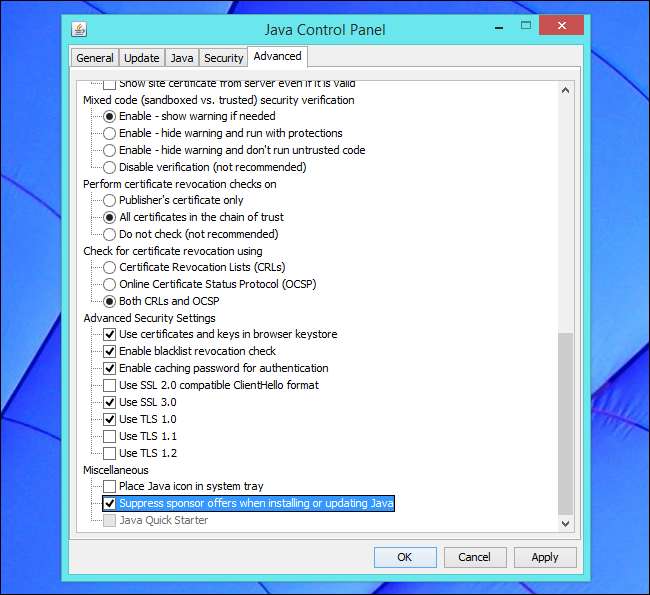 Перейдите на вкладку Advanced и прокрутите вниз до самого низа - да, они скрыли эту опцию в самом низу списка Advanced. Установите флажок «Не предлагать спонсора при установке или обновлении Java» и нажмите «ОК».