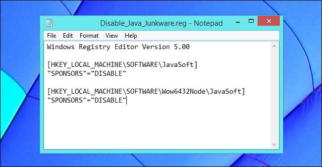 Сохраните файл и дайте ему расширение файла .reg, например Disable_Java_Junkware.reg. Дважды щелкните файл .reg и импортируйте его.