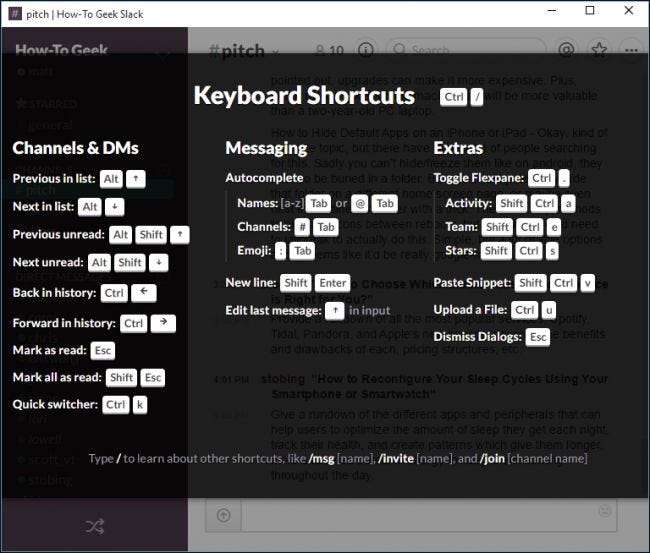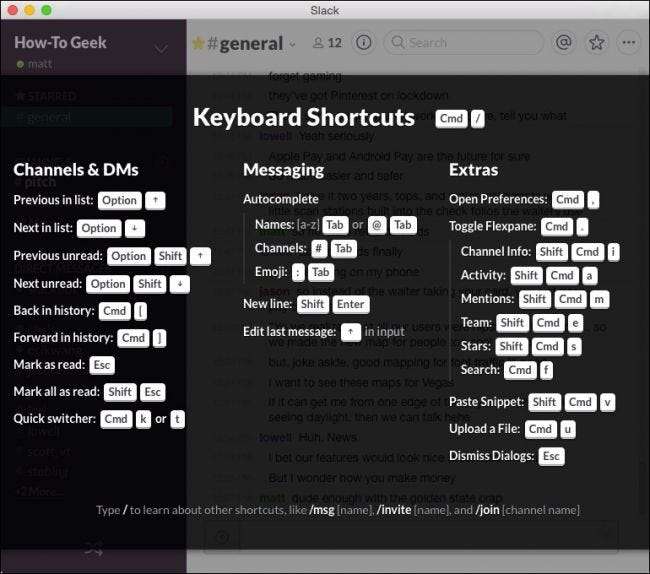 Во-первых, сочетания клавиш. Мы настоящие любители сочетаний клавиш здесь, поэтому имеет смысл, что мы были бы очень заинтересованы в них для Slack. Если вы используете сочетание клавиш «Command + /» на Mac или «Control + /» в Windows, откроется экран сочетаний клавиш.