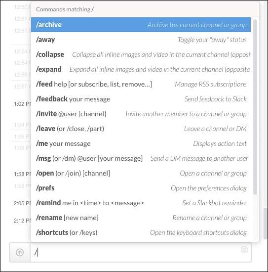 Если вы нажмете клавишу «/» в окне создания сообщения, появится список команд.