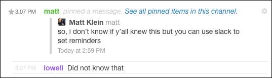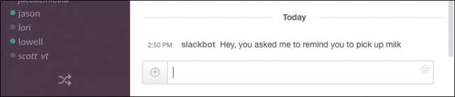 Кстати о напоминаниях: они очень полезны, если вы оказались заняты работой и вам нужно побудить себя сделать что-то важное. Вы можете использовать команду «/ напомнить», чтобы Slackbot послал вам сообщение, напоминающее вам написать кому-нибудь, или ввести электронное письмо, или просто взять немного молока в магазине.