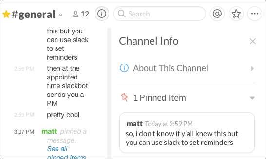 В любом случае, вы можете закрепить элемент, и он останется там, где его смогут увидеть все. Просто щелкните маленькую букву «i» рядом с функцией поиска, чтобы увидеть все закрепленные элементы в канале.