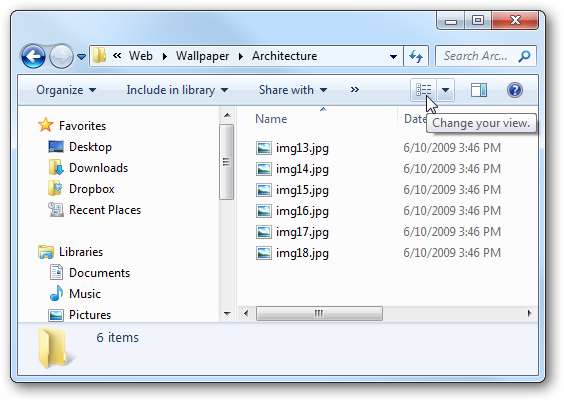В проводнике Windows вы можете щелкнуть Измените свой взгляд кнопка для переключения между разными размерами значков. В этом примере мы находимся в режиме просмотра "Подробности", который дает вам больше данных о просматриваемых файлах.