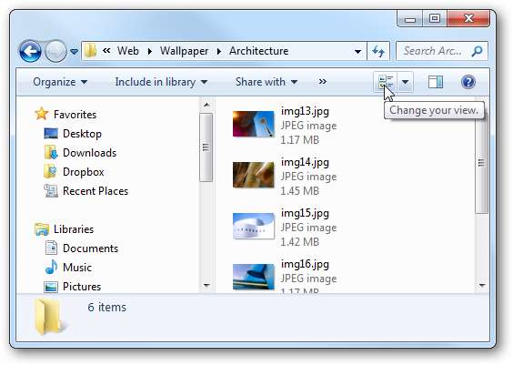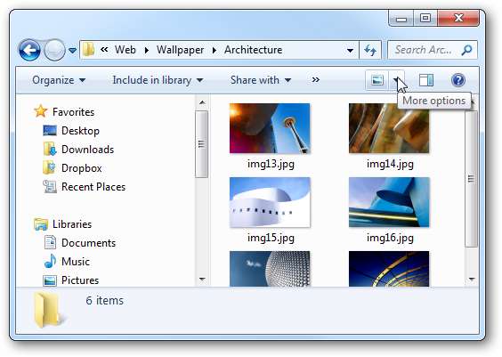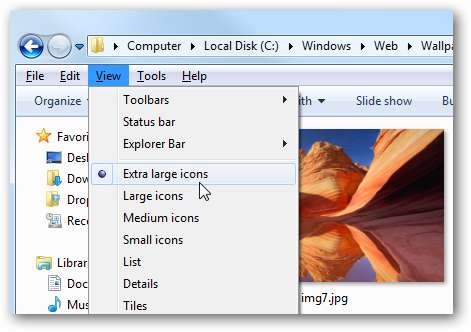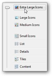 В проводнике Windows 7 легко изменить вид миниатюр и других файлов, щелкнув значок Измените свой взгляд кнопку в проводнике. Что вы, возможно, не заметили, так это то, что есть настройка очень большого просмотра.