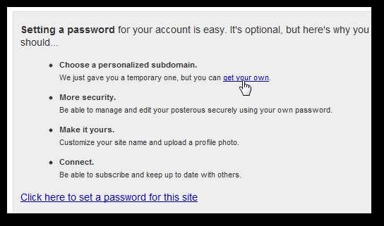Теперь введите имя сайта и пароль, которые вы хотите, и нажмите Подписаться чтобы начать настройку своего блога Posterous.
