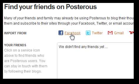 Вам будет предложено найти друзей из вашей электронной почты и социальных сетей, которые могут использовать Posterous, но вы можете пропустить это, если хотите.
