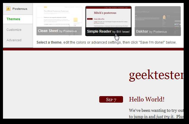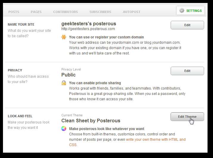 Самая важная часть панели инструментов - это панель настроек. Это позволяет вам изменить многие функции вашего блога. Большинство людей захотят настроить свой блог, и Posterous предлагает множество вариантов персонализации. Щелкните значок Редактировать тему кнопка рядом Смотреть и чувствовать для редактирования вашей темы.