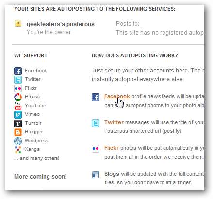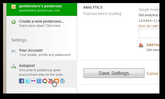 Еще одна вещь, которую вы можете заметить на левой боковой панели: Автопост . Выберите этот параметр, чтобы Posterous автоматически обновлял различные онлайн-сервисы всякий раз, когда вы публикуете контент на Posterous.