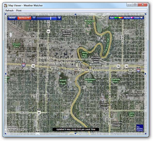 Еще одна замечательная функция - проверка регионального или национального радара, который работает на Microsoft Virtual Earth и The Weather Channel.
