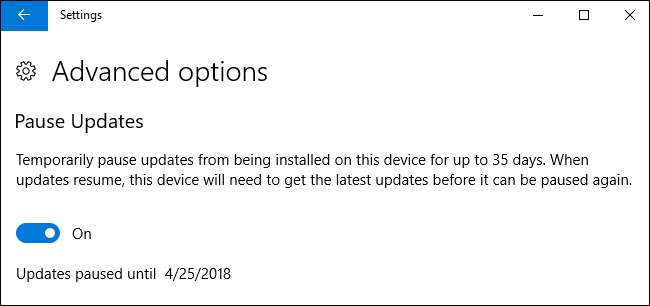 По истечении 35 дней - или если вы возобновите обновления с помощью переключателя здесь - Windows автоматически загрузит последние обновления, прежде чем вы сможете снова приостановить обновления.