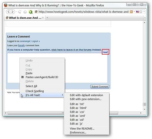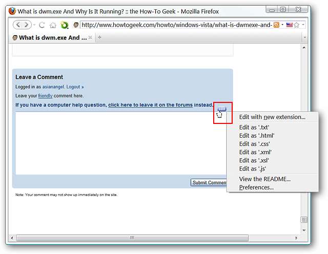 Теперь вернемся к исходной текстовой области комментария. Как видите, кнопка «Изменить» теперь отображается в раскрывающемся меню (доступ осуществляется щелчком правой кнопкой мыши). Щелчок непосредственно на «кнопке редактирования» откроет текстовый редактор, который вы выбрали в опциях.