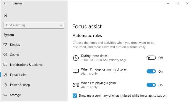 Focus Assist автоматически включается в определенных ситуациях, например, когда вы дублирование вашего дисплея или играть в игры DirectX в полноэкранном эксклюзивном режиме. Он также поддерживает различные приоритеты уведомлений, поэтому вы можете разрешать уведомления с высоким приоритетом и временно блокировать уведомления с низким приоритетом. Вы увидите сводку всех уведомлений, которые вы пропустили, когда отключите Focus Assist.