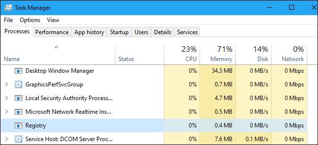 - Процесс реестра : Если вы посмотрите на диспетчер задач, вы увидите новый процесс под названием «Реестр». Это минимальный процесс, предназначенный для хранения данных куста реестра для ядра Windows. Поскольку данные в любом случае ранее хранились в ядре, общее использование системной памяти остается прежним. Microsoft заявляет, что это позволит им в будущем оптимизировать объем памяти, используемый реестром.