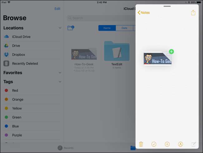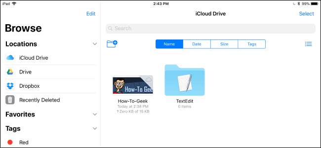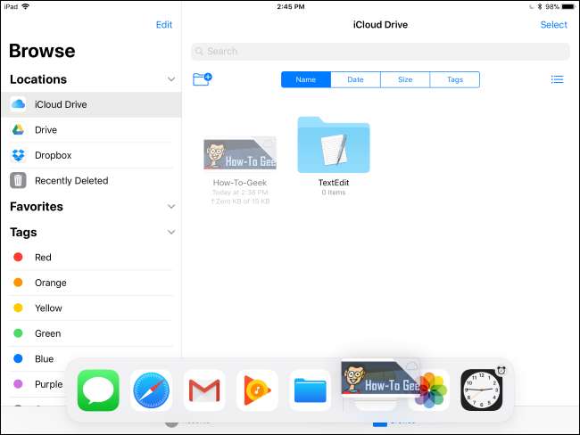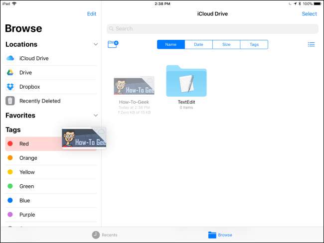 Само приложение «Файлы», конечно, показывает больше контента на большом экране iPad. Это позволяет вам легко перетаскивать файлы внутри самого приложения. Вы можете перетащить файл в другую службу, чтобы переместить его, в папку «Недавно удаленные», чтобы удалить его, или в тег, чтобы пометить его. Вы также можете выбрать несколько файлов перед их перетаскиванием.