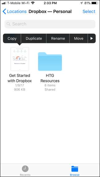 Чтобы скопировать, дублировать, переименовать, переместить, поделиться, пометить или просмотреть информацию о файле, нажмите и удерживайте его, и вы увидите меню. Нажмите на нужный вариант в меню. Приложение «Файлы» позволяет перемещать файлы между несколькими службами облачного хранения, поэтому отсюда вы можете переместить файл из iCloud Drive в Dropbox или наоборот.