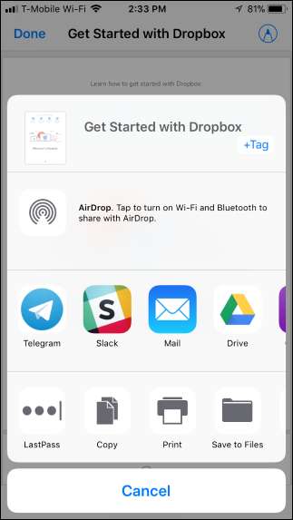 При просмотре файла вы можете нажать на опцию «Поделиться», чтобы открыть его в любом приложении, поддерживающем этот тип файла, или выполнить другие действия. Например, отсюда вы можете прикрепить его к сообщению или электронному письму. Вы также можете использовать лист общего доступа для беспроводного обмена файлом с другим устройством через AirDrop .
