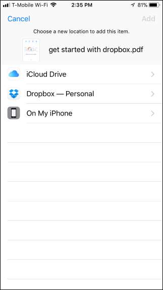 Вы увидите опцию «Сохранить в файлы» на странице общего доступа по всей системе, которая позволяет быстро сохранить файл в приложении «Файлы». Коснитесь его, и вы можете выбрать, где вы хотите сохранить файл.
