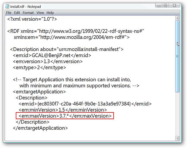 Откройте файл в «Блокноте», чтобы вы могли изменить номер для «maxVersion». Здесь число указано как «3.5. *», Но нам нужно было увеличить его…