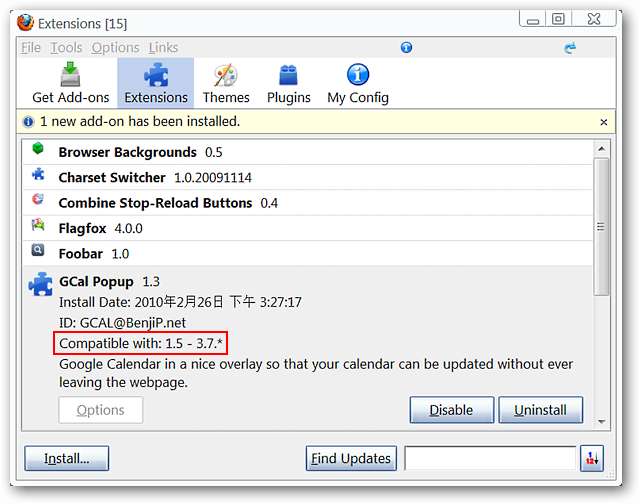 Как только ваш браузер запустится, вы можете проверить «Окно диспетчера надстроек» и увидеть номера совместимости версий для расширения. Выглядит очень-очень красиво!