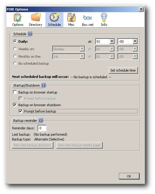 Вкладка «Расписание» позволяет нам настроить FEBE для периодического резервного копирования конфигурации Firefox.