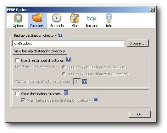 FEBE выбирает Box.net в качестве инструмента онлайн-резервного копирования по умолчанию, но, вероятно, лучше использовать что-то еще, например папку Dropbox.