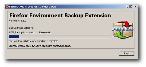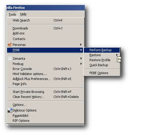 Выполните резервное копирование, выбрав Инструменты -> FEBE -> Выполнить резервное копирование.