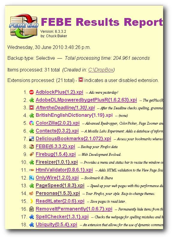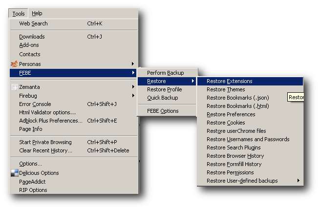FEBE хранит наши расширения как файлы .xpi, а наш профиль Firefox как файл .fbu. Щелкните Инструменты -> FEBE -> Восстановить.