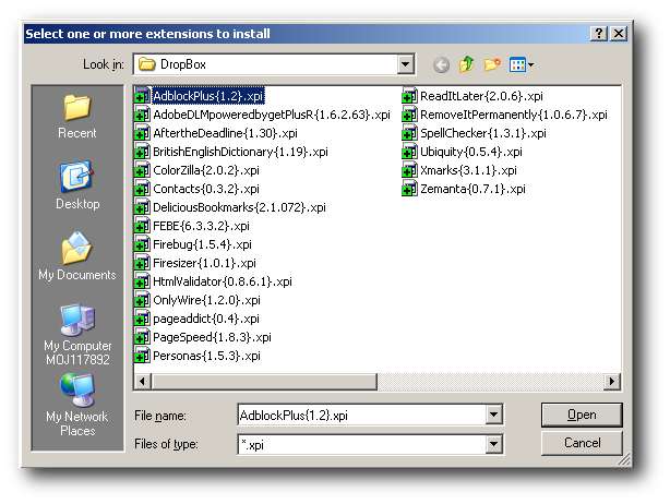 Мы можем восстановить наши расширения, выбрав один или несколько файлов * .xpi в наших резервных папках.