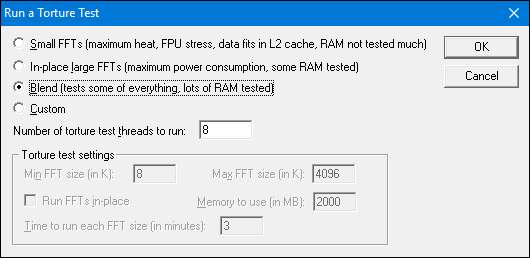 Prime95 предлагает сразу же провести тест на пытки. Тест на пытки идеально подходит для проверки стабильности и тепловыделения вашего процессора и особенно полезен, если вы его разогнали. Если вы хотите провести тест на пытки, нажмите кнопку «ОК». Обратите внимание, что выполнение теста на пытки может занять некоторое время. Если вместо этого вы просто хотите выполнить тест, нажмите кнопку «Отмена».