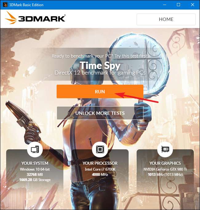 После загрузки и установки запустите 3DMark. На домашней странице нажмите кнопку «Выполнить», чтобы протестировать ваш компьютер. Отображаемый вами тест будет зависеть от версии Windows и DirectX, которые вы используете. Для ПК с Windows 10 эталонным тестом по умолчанию является Time Spy.