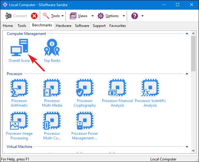 Скачав и установив Sandra, запустите ее. В главном окне перейдите на вкладку «Бенчмарки», а затем дважды щелкните опцию «Общий балл». Кроме того, вы можете запустить тестовые тесты для определенных компонентов.