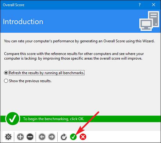 Тест «Общая оценка» включает тесты вашего процессора, графического процессора, пропускной способности памяти и производительности файловой системы. Убедитесь, что выбран параметр «Обновить результаты, запустив все тесты», а затем нажмите «ОК» (кнопка с галочкой), чтобы запустить тесты.